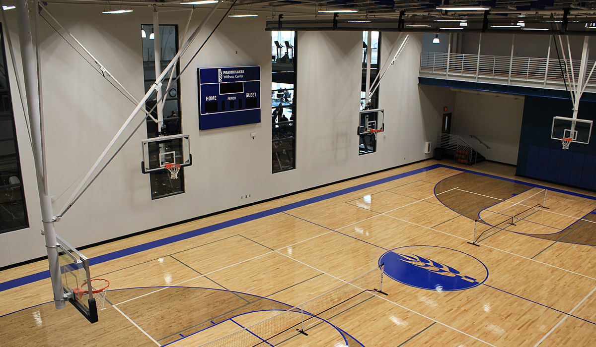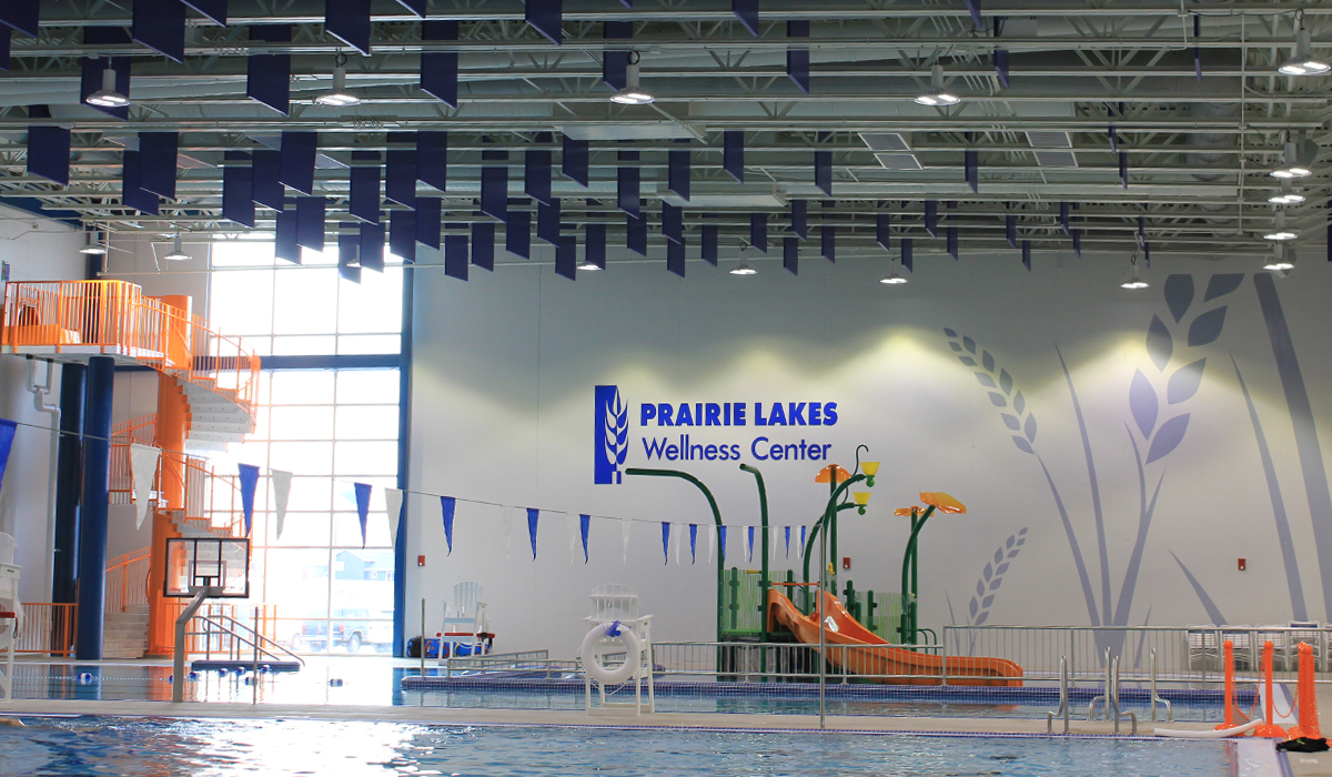The Prairie Lakes Wellness Center is a $23 million-dollar recreational facility. The 105,000-square foot, two-story facility features a four-court gymnasium, three different pools, fitness rooms, racquetball courts, locker room space, and a child watch area. The Caliber team designed graphic components for the entire facility, from signage to graphic wall installations and court flooring.
